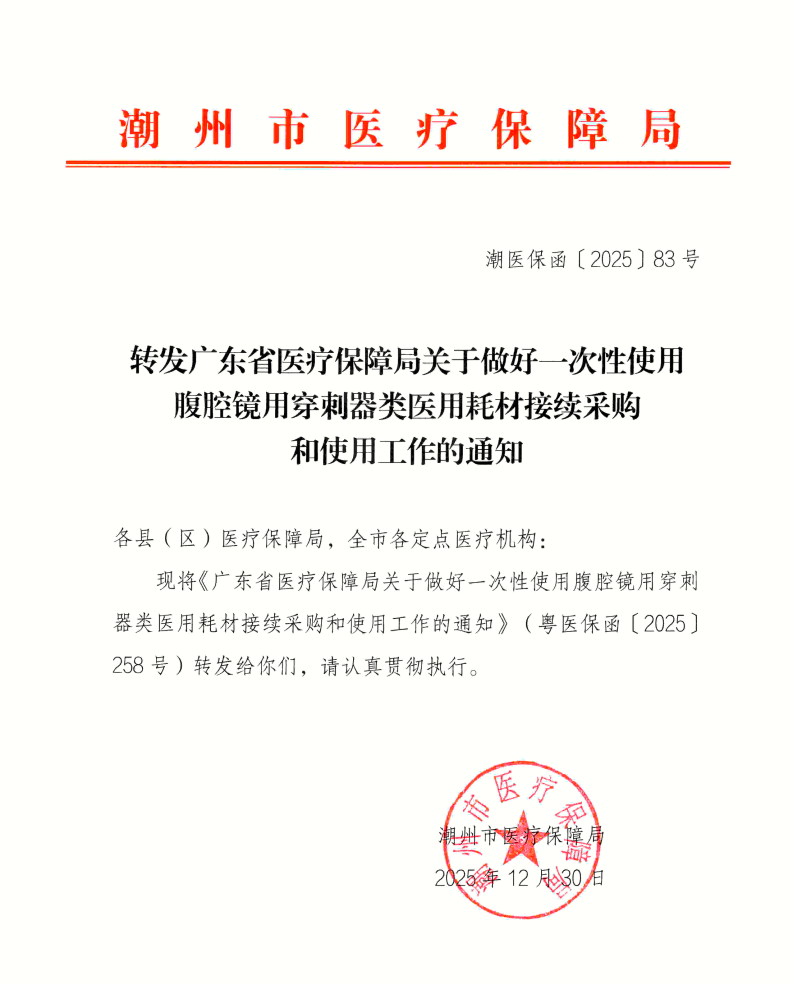 現(xiàn)將《廣東省醫(yī)療保障局關(guān)于做好一次性使用腹腔鏡用穿刺器類醫(yī)用耗材接續(xù)采購和使用工作的通知》(粵醫(yī)保函〔2025]258號)轉(zhuǎn)發(fā)給你們,請認(rèn)真貫徹執(zhí)行。