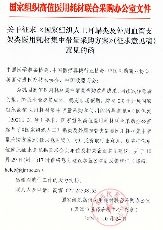 關(guān)于征求《國(guó)家組織人工耳蝸類(lèi)及外周血管支架類(lèi)醫(yī)用耗材集中帶量采購(gòu)方案》(征求意見(jiàn)稿)意見(jiàn)的函(非官方)